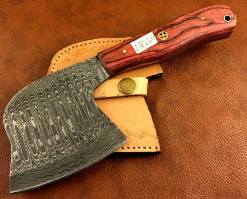 Title (ebay affiliate link): Handmade Damascus Steel Axe-Fully Functional-Camping-Heat Treated-Sheath-Dh260