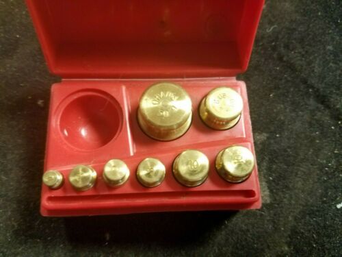 Title (ebay affiliate link): Vintage OHAUS Brass Scale Weight Set of 7 Pcs. 1 - 50 Gram w/ Case