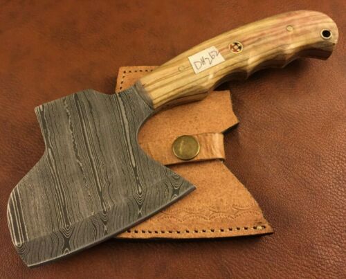 Title (ebay affiliate link): Handmade Damascus Steel Axe-Fully Functional-Camping-Heat Treated-Sheath-Dh262