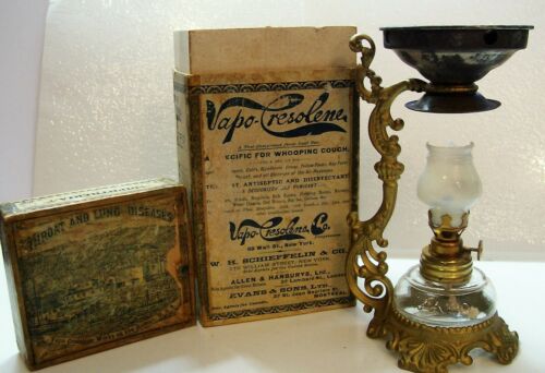 Title (ebay affiliate link): VINTAGE 1888 VAPO-CRESOLENE MINIATURE OIL LAMP VAPORIZER ORIGINAL BOX PAPERS