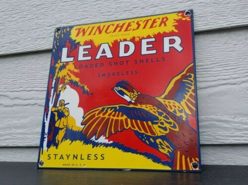 VINTAGE LEADER AMMUNITION PORCELAIN FIREARM SHOT GUN SHELL AMMO WINCHESTER SIGN