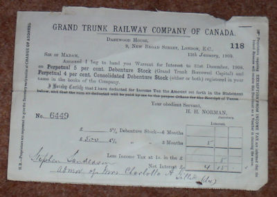 Title (ebay affiliate link): 1909 GRAND TRUNK RAILWAY OF CANADA - DIVIDEND STATEMENT