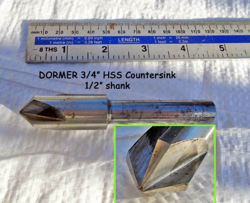 Title (ebay affiliate link): DORMER 4 Flute 3/4" 90 deg HSS Countersink Bit 1/2" Shank vgc Old Tool