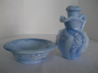 AVON Blue Marble Milk Glass Pitcher & Bowl Bottle 1978