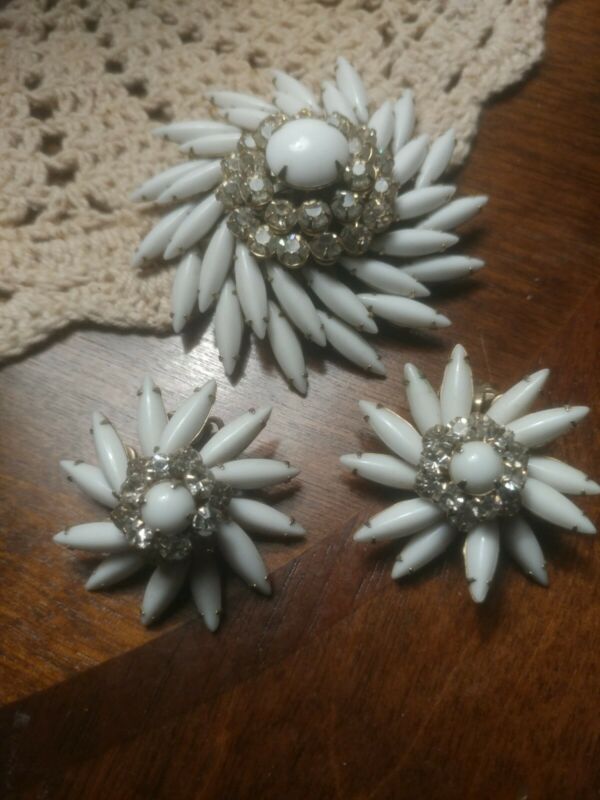 Title (ebay affiliate link): WOW Vintage Judy Lee Milk Glass flower and rhinestone brooch w/ Earrings