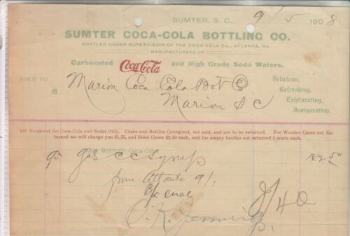 Title (ebay affiliate link): SUMTER COCA-COLA BOTTLING CO. INVOICE DATED 9/5 1908 112 YEARS OLD