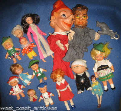 Nice lot of hand puppets & ethnic small dolls in hatbox