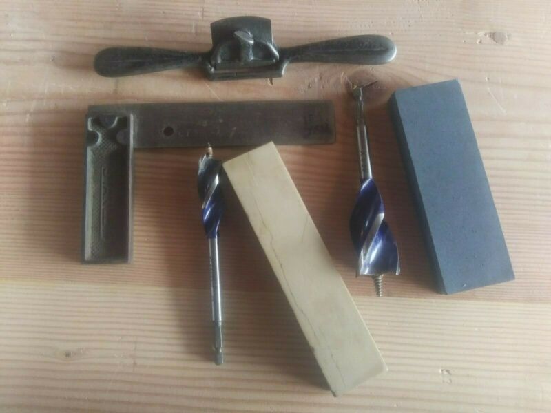 Title (ebay affiliate link): Lot of Old Carpentry Tools Stanley Try Square Spokeshave Sharpening Stones