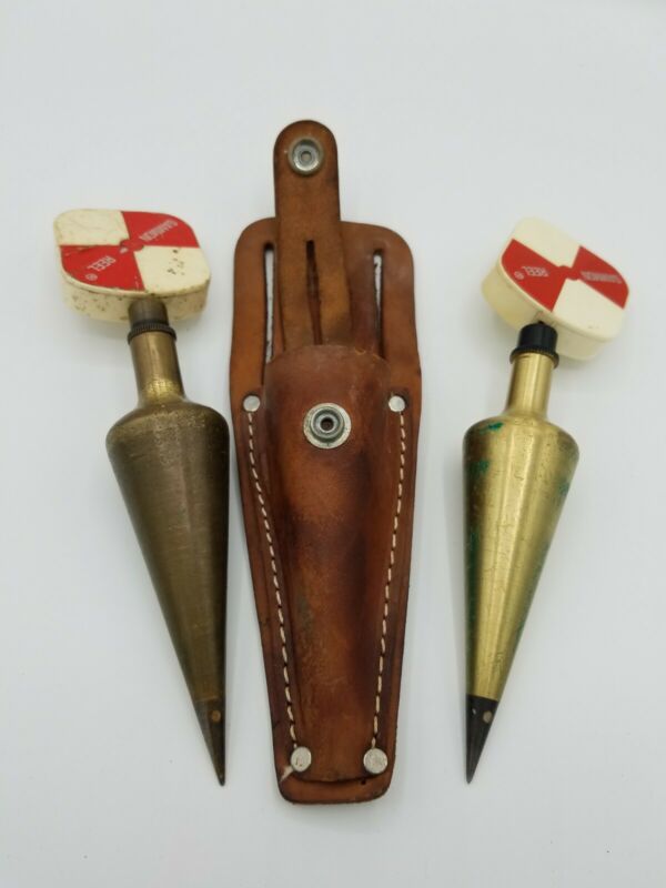 Title (ebay affiliate link): 2 Vintage Brass Plumb Bobs w/ Attached Gammon Reels In leather Case/holster.
