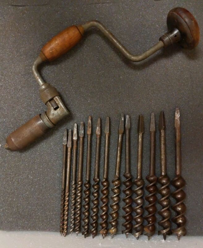 Vintage Set of 13 RUSSELL JENNINGS Auger Bits & PEXTO #108 8" Swing Wood Brace