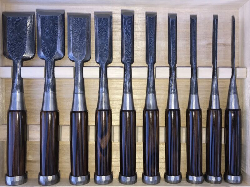 Title (ebay affiliate link): RARE Zinsaku Damascus Japanese Chisel Set 10 Piece Set Ebony Handle New