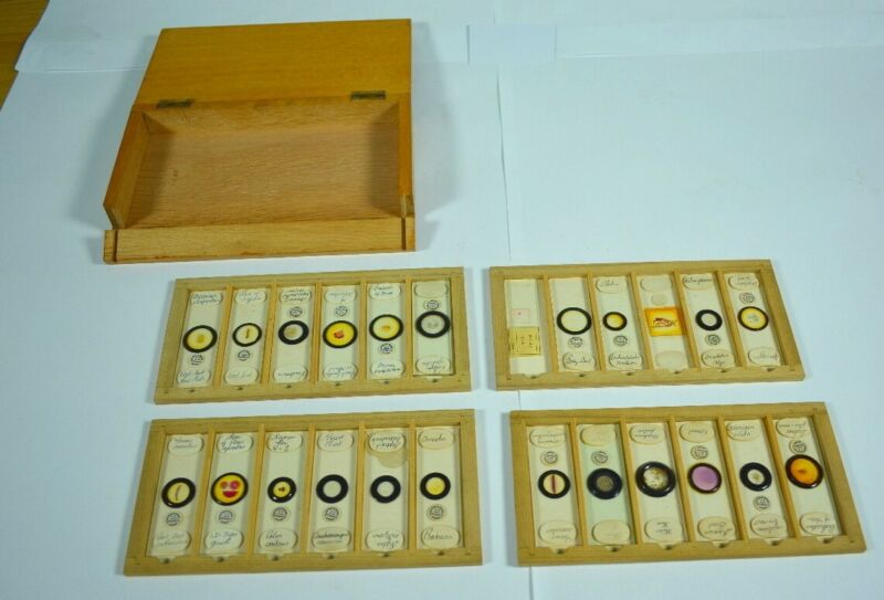 Title (ebay affiliate link): Antique Box of 24 Microscpe Slides in 6 wooden trays and box
