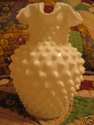 FENTON WHITE MILK GLASS HOBNAIL DBL RUFFLED VASE VINTAG