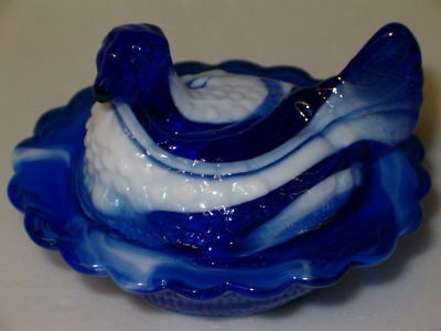COBALT MILK SLAG GLASS HEN CHICKEN ON NEST BASKET DISH