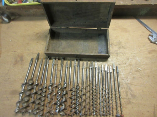 24 vintage auger bits & box ford rit, snell, OVB, acrabore, albert lea, keen