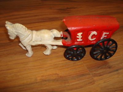 VINTAGE TOY HORSE DRAWN CAST IRON ICE WAGON