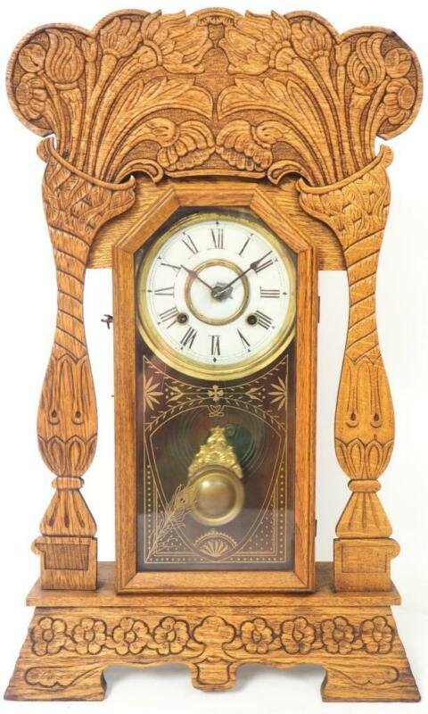New Haven Antique Oak Gingerbread Mantel Clock 8 Day Striking Mantle Clock C1900