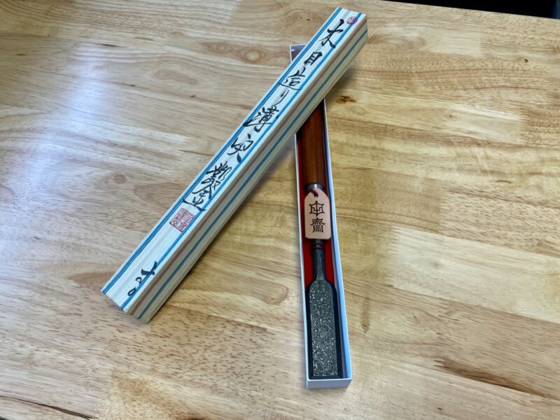 Title (ebay affiliate link): Tasai Paring Chisel (30mm)- "Mokume" Blue Steel Damascus Pattern Finish