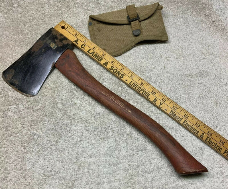 Title (ebay affiliate link): NICE! Vintage PLUMB Hatchet W/Original PLUMB Hickory Handle Military Sheath?