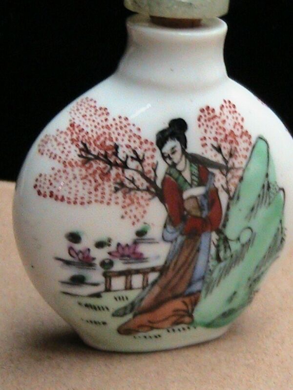 Title (ebay affiliate link): Vintage Chinese Snuff Bottle Jade Cap Hand Painted Milk Glass / Porcelain Signed