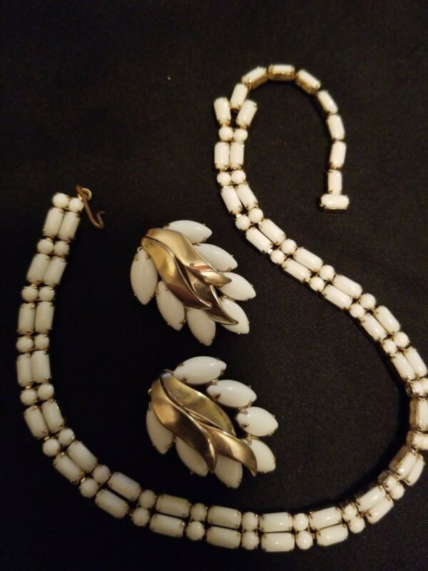 Title (ebay affiliate link): Vintage Estate Milkglass Necklace And Milkglass Clip Statement Piece Earrings.