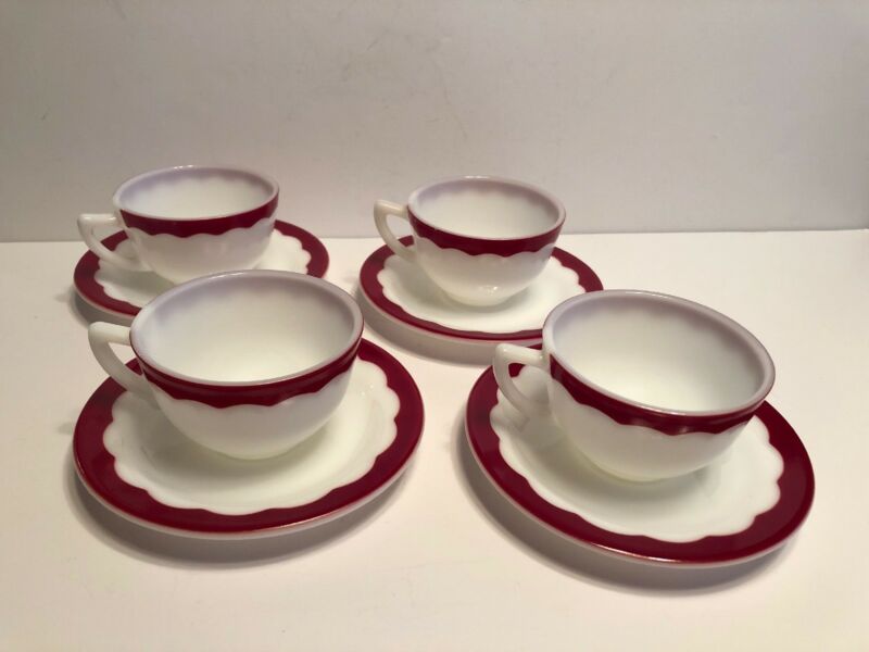 VTG 4 Cups & 4 Saucers - Corning Dinnerware White Milk Glass With Red Scallop