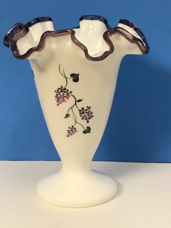 Title (ebay affiliate link): FENTON LILACS ON MILK GLASS SPANISH LACE VASE PURPLE CREST HAINDPAINTED NICE!