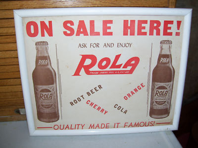 1945 ROLA SODA SIGN IN FRAMED WITH TWO BOTTLES