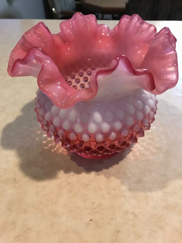 Title (ebay affiliate link): VINTAGE FENTON? CRANBERRY PINK & WHITE MILK GLASS HOBNAIL FOOTED & RUFFLED VASE