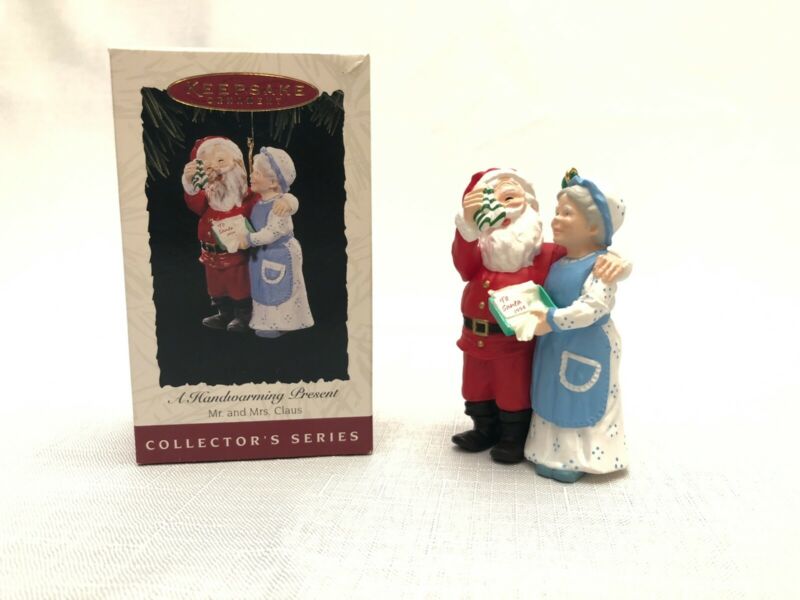 Title (ebay affiliate link): Hallmark Keepsake A Handwarming Present Mr and Mrs Claus Christmas Ornament 1994