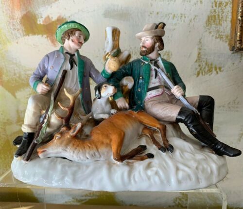 Antique Imperial Russian Popov porcelain figurine group hunters dog deer game
