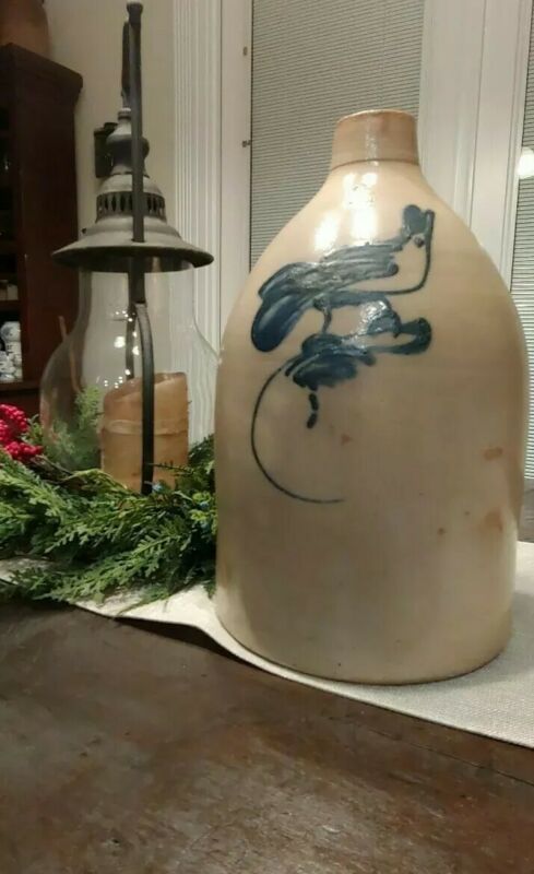 GORGEOUS 2 GALLON SALT GLAZED 2 GALLON JUG WITH BLUE COBALT BIRD.