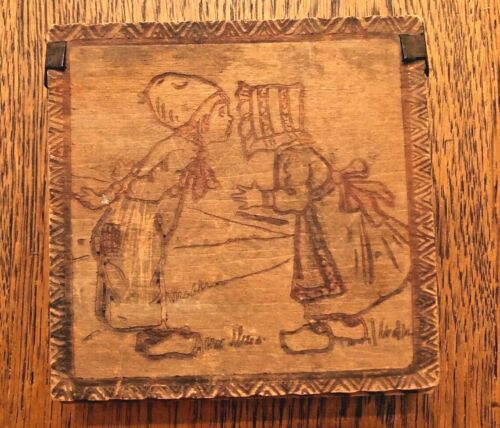 Vintage Pyrography Dutch Boy and Girl Design Hinged Wooden Box