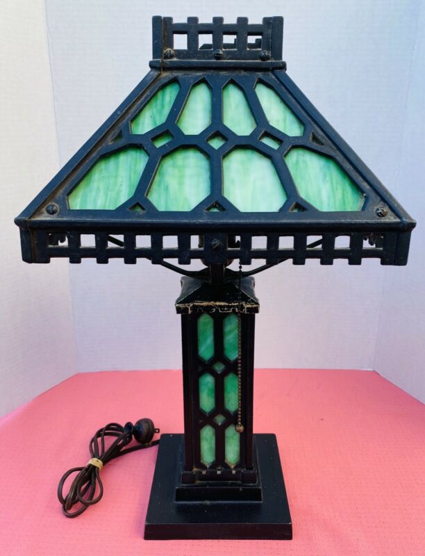 Title (ebay affiliate link): Antique Bradley & Hubbard Arts And Crafts Mission Slag Glass Lamp Cast Iron NICE