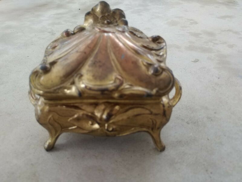 Antique art nouveau flowers sculpture metal jewelry box dresser vanity casket