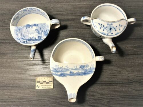 3 Victorian Invalid Baby Infant Medical Feeders Porcelain China Flow Blue