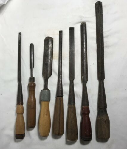 Title (ebay affiliate link): Lot of 7 vintage antique chisels framing timber gouges corner Stanley ? wood