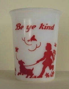 HAZEL ATLAS Be Ye Kind CHILDS MILK GLASS Red Graphic