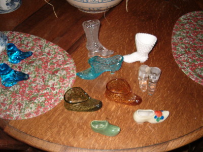 LOT 9 DECORATIVE SHOES-GLASS,CERAMIC,MILKGLASS-FENTON