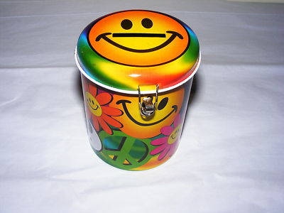 Title (ebay affiliate link): PEACE SIGN Smiley Face tin CAN container Flowers BANK