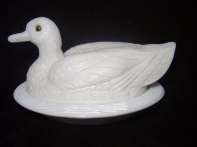 Challinor Tiffin Milk Glass Duck Covered Dish Glass Eye