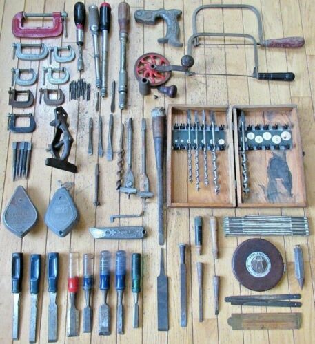 Title (ebay affiliate link): Lot of Antique Vintage Woodworking Tools - Chisels, Push Drills, Clamps, Rules