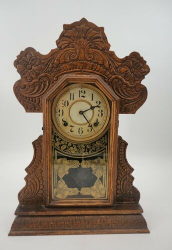 Title (ebay affiliate link): ANTIQUE E. INGRAHAM CO. BRISTOL CONN. ORNATE WOODEN MANTLE SHELF CLOCK ~ WORKING