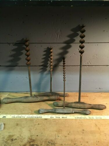 4 VINTAGE Farm Tool Barn BEAM Augers Decor WOODEN HANDLEs!