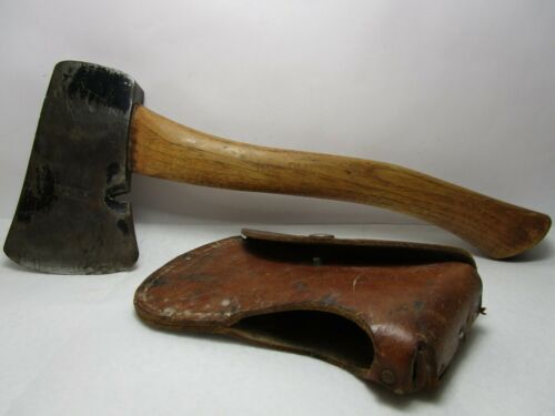 Title (ebay affiliate link): VINTAGE PLUMP HATCHET AXE WITH PLUMB SHEATH CAMP WOODSMAN