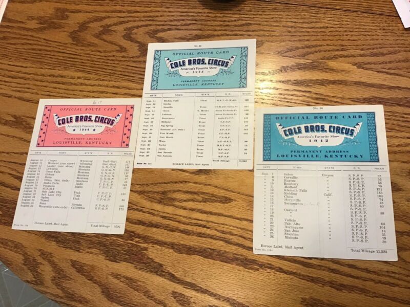 3 COLE BROS CIRCUS ROUTE CARDS 1942-44-48