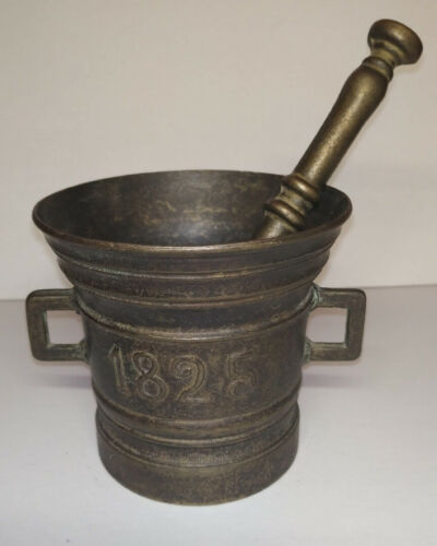 Title (ebay affiliate link): Vintage Solid Bronze / Brass Pedestal Mortar & Pestle - embossed 1825