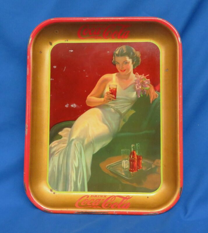 Title (ebay affiliate link): Original 1936 Coca-Cola Metal Tray Lady White Dress Sitting American Art Works