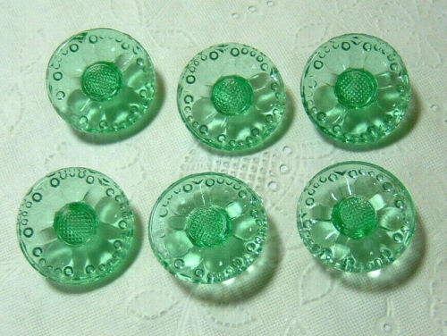 SET OF 6 LOVELY VINTAGE GREEN DEPRESSION GLASS BUTTONS CAKE PLATE STYLE 11/16"