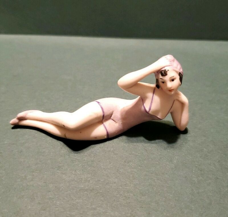 Title (ebay affiliate link): Antique German Porcelain Bathing Beauty In Her Purple Swimsuit 3 1/2" #5684